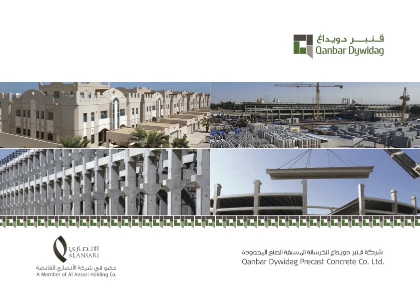 Comprehensive company profile presenting Qanbar Dwedag’s expertise in precast, steel, and concrete construction. The clean, industrial layout communicates strength, quality, and large-scale project capability.