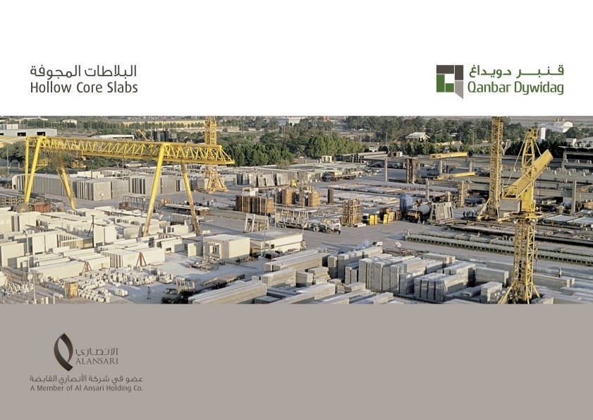 Corporate brochure outlining Qanbar Dwedag’s precast hollow core slab systems. Designed with technical precision to highlight product specifications, structural efficiency, and engineering reliability.