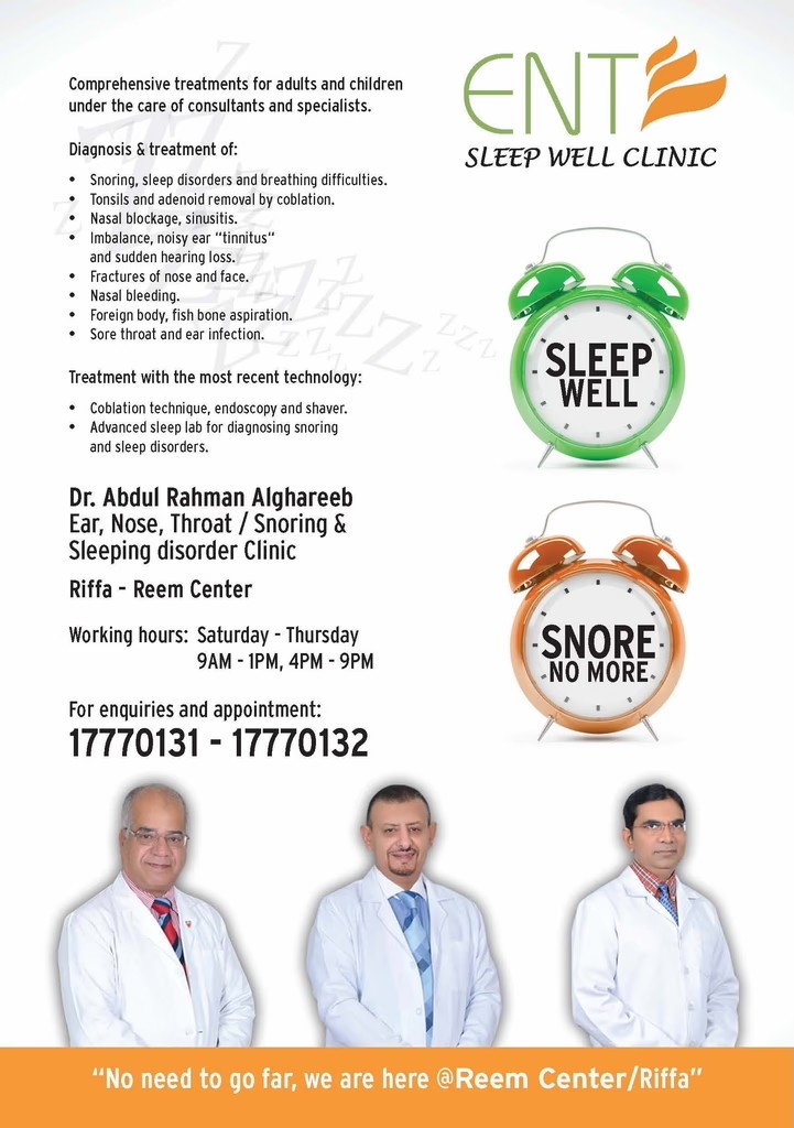 An A5 bilingual flyer promoting ENT Sleep Well Clinic’s medical services. Features clear visual hierarchy and friendly photography to emphasize patient care, wellness, and professional expertise.