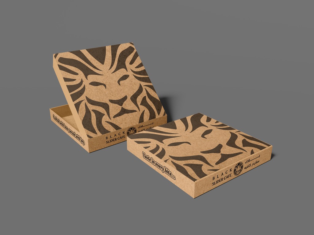 Eco-friendly packaging for Slider Café’s pizza menu. The box design highlights the bold lion mark while maintaining brand cohesion through earthy tones and strong graphic identity.