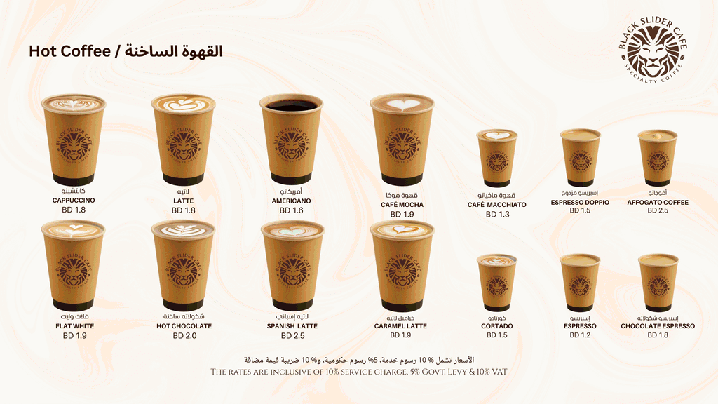 Comprehensive beverage menu featuring Slider Café’s best-selling drinks. Designed with visual hierarchy and warm color tones to reflect the café’s welcoming atmosphere and quality offerings.