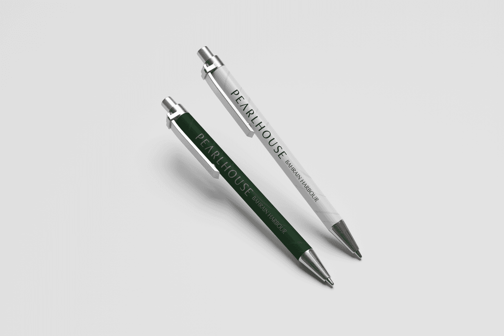 Custom-designed Pearlhouse pens featuring the hotel’s identity, used as part of the brand’s corporate and guest-facing materials.