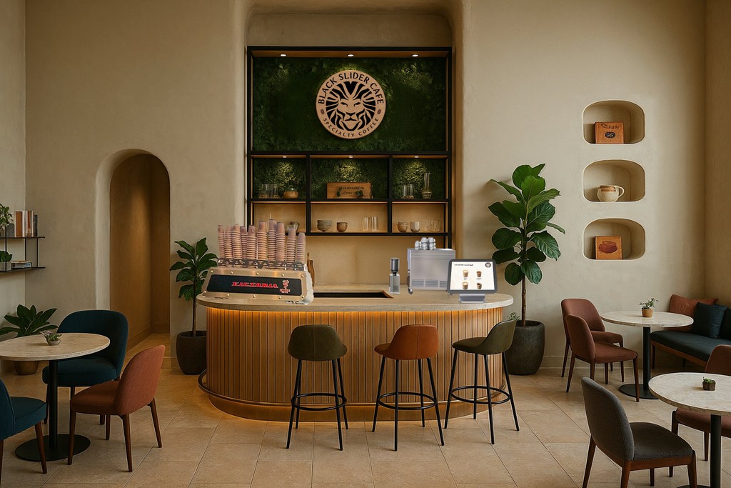 Interior design and branding proposal for the new Slider Café branch at Liwan. The visuals focus on warm tones, natural textures, and elegant signage to reflect a premium café experience.